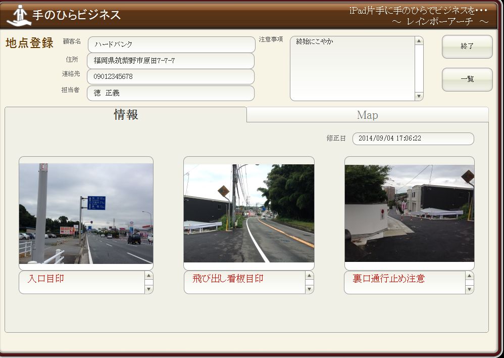 訪問先・住所・担当者・連絡先等を入力できるようにし、それらのデータから訪問先のMAPを表示できるようにします。