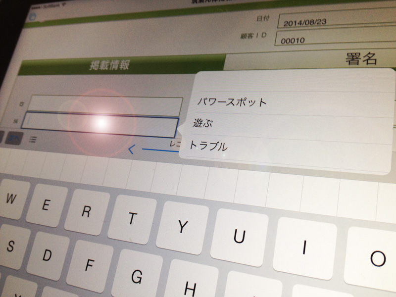 iPadで入力や登録をする際は・・・ 選択候補をあらかじめ準備して置くと便利ですね。 例:商品名 ブラックコーヒー ブレンドコーヒー アイスコーヒー 画像のようにあらかじめ準備しておいた候補を選択する事を ドロップダウン と言います。 このドロップダウンんを使い、あらかじめ準備することでタッチ作業で登録でき、PCに弱いスタッフでもこれなら簡単に登録や作業ができます。 あなただったらどういう候補リストを作りますか? 心はアナログ 仕事はビジネス Tagged on: ipad ipadでエクセル ドロップダウン ビジネス