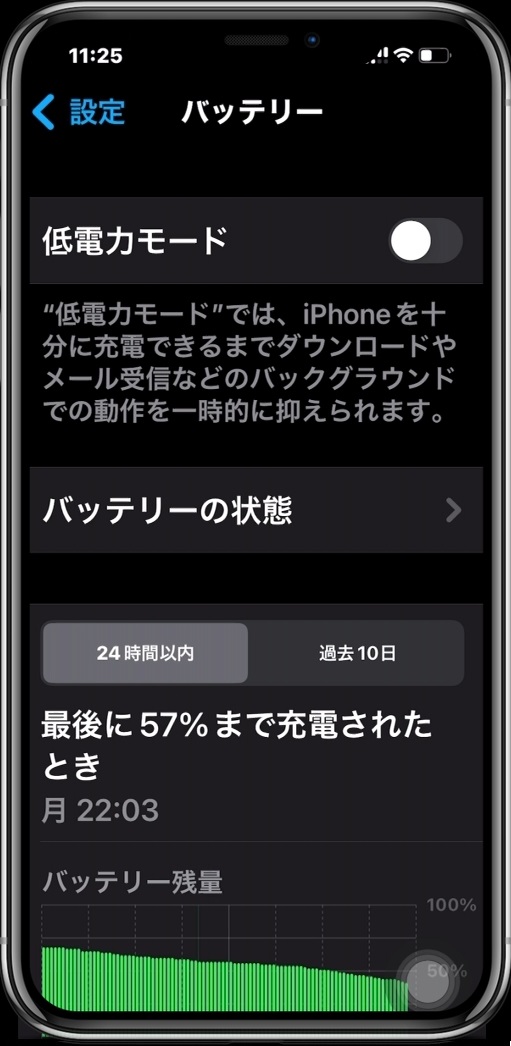 画面中央「バッテリー残量」にバッテリーの充電状況の推移があり、24時間以内の充電具合、減り具合が確認できます。