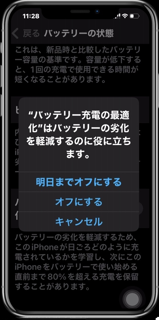 を選択し、「バッテリー充電の最適化」の設定を行わないようにすることで、iOS13以前の、ご自身でのバッテリーのコントロールが選択できます。