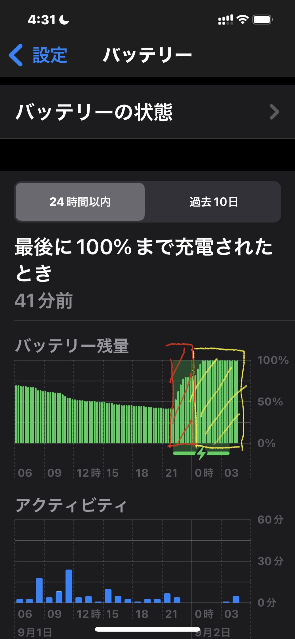 朝起きて、100%のハズのiPhoneのバッテリー容量が・・・